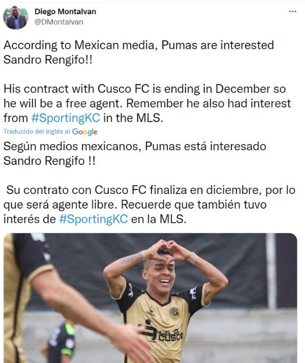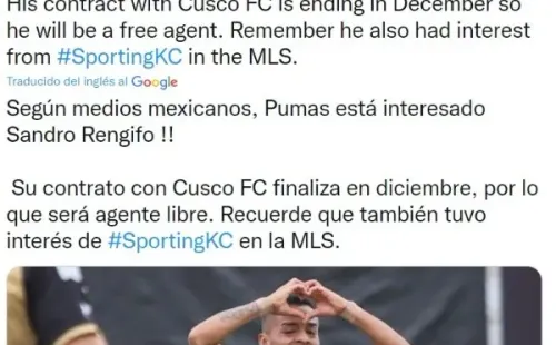 Sandro Rengifo, quien jugó con Cusco FC la temporada pasada, es uno de los futbolistas que ha destacado en la Liga 1 en esta temporada, pues su dribling, gambeta y conduccióncon el balón han dejado sorprendidos a varios, entre ellos a equipos internacionales como el Puma de la Liga MX quien, según indica un medio mexicano, ya lo tendría en su radar para el 2022.