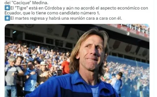 “Vélez intentará concretar el regreso de Ricardo Gareca como sucesor del “Cacique” Medina. El “Tigre” está en Córdoba y aún no acordó el aspecto económico con Ecuador, que lo tiene como candidato número 1. El martes regresa y habrá una reunión cara a cara con él”, publicó César Luis Merlo.