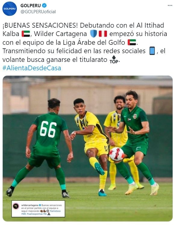 Otro peruano, que también estuvo en la Copa América con la Selección Peruana es Wilder Cartagena quien tras su salida de Godoy Cruz llegó a Al – Ittihad, en la Liga Árabe del Golfo, el volante tuvo algunos minutos en el partido amistoso frente a Shabab Al – Ahly, debutando así con su nuevo club. El volante fue sustituido en el minuto 78 del encuentro y su equipo perdió por 1-0. El ex Godoy Cruz publicó en su Instagram lo siguiente: “Buenas sensaciones en el primer partido con el equipo. A seguir mejorando“.