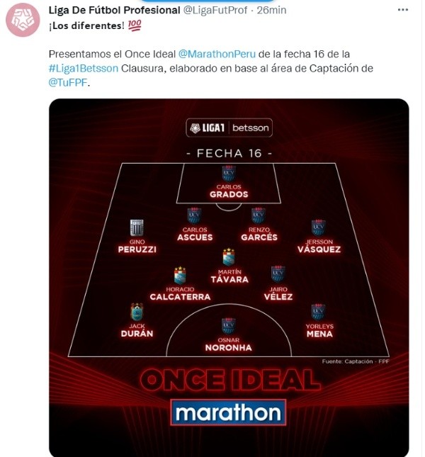 Así pues, los que aparecen en el once ideal de la fecha 16 del Torneo Clausura son: el portero Carlos Grados, los defensas Carlos Ascues, Renzo Garcés y Jersson Vásquez, de igual forma el volante Jairo Vélez y los delanteros Osnar Noronha y Yorleys Mena.