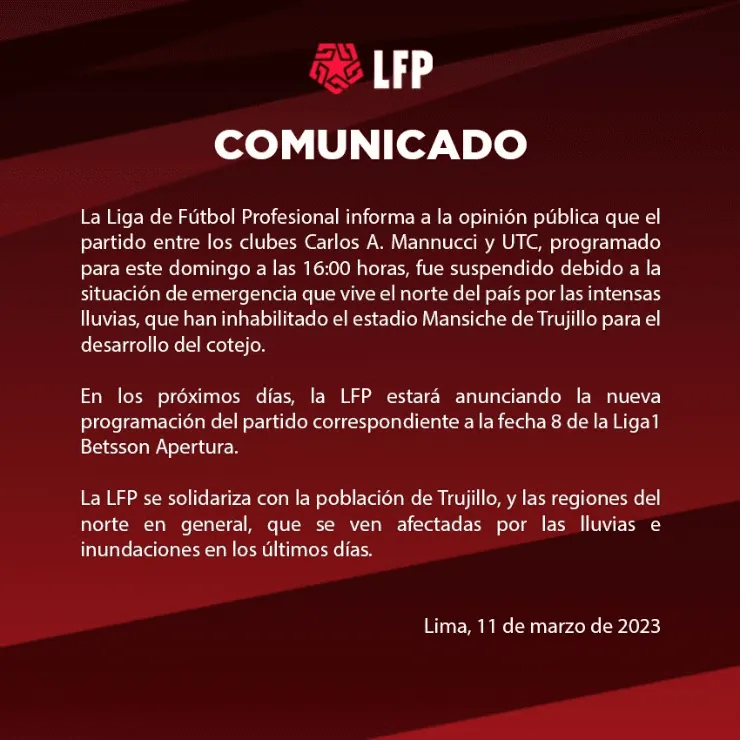 “La Liga de Fútbol Profesional informa a la opinión pública que el partido entre los clubes Carlos A. Mannucci y UTC, programado para este domingo a las 16:00 horas, fue suspendido debido a la situación de emergencia que vive el norte del país por las intensas lluvias, que han inhabilitado el estadio Mansiche de Trujillo para el desarrollo del cotejo”, se lee en el comunicado.