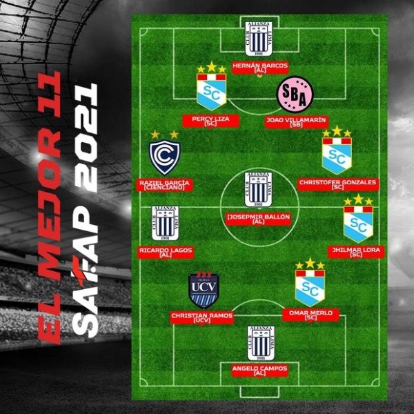 De esta forma, el plantel ideal de la Liga 1 temporada 2021, según Safad, está conformado por: Ángelo Campos en el arco, Jhilmar Lora, Omar Merlo, Christian Ramos y Ricardo Lagos en la defensa; Josepmir Ballón, Christofer Gonzales y Raziel García en la volante y Joao Villamarín, Percy Liza y Hernán Barcos en la ofensiva.