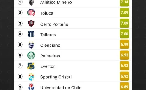 Para alegría de los peruanos, Cienciano del Cusco aparece en la quinta casilla con 6.99 y Sporting Cristal en la octava ubicación con 6.92. Recordemos que el primero tiene una actuación descollante en la Liga 1 y el segundo consiguió su pase a la Fase 3 de la Copa Libertadores.