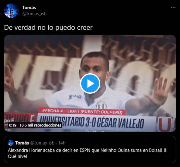 El cual no pasó desapercibido en las redes sociales, donde no perdonaron tamaño error en su posición sobre el tema en debate. Estaban hablando sobre Universitario de Deportes, específicamente sobre uno de sus referentes, Nelinho Quina. Y ahí la comunicadora social precisó.