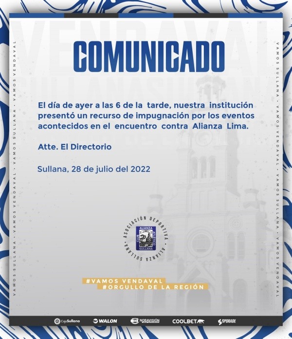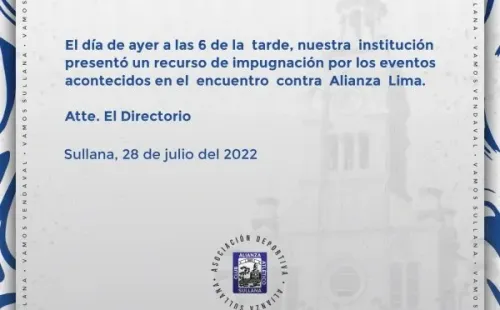 Mediante su red social, el equipo dirigido por el uruguayo, Mario Viera, alzó su voz de protesta, con el siguiente comunicado oficial. Buscando una respuesta inmediata por las autoridades: “El día de ayer a las 6 de la tarde, nuestra institución presentó un recurso de impugnación por los eventos acontecidos en el encuentro contra Alianza Lima”.