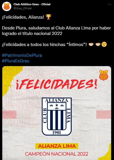 Atlético Grau subió un saludo en redes sociales por el título nacional de Alianza Lima con el siguiente mensaje: “¡Felicidades, Alianza! Desde Piura, saludamos al Club Alianza Lima por haber logrado el título nacional 2022. ¡Felicidades a todos los hinchas “Íntimos”!”, propusieron. Y automáticamente, la caja de comentarios fue llenada por fanáticos del cuadro ‘blanquiazul’, por un solo motivo en especial.