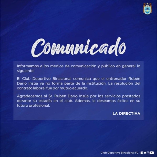 ‘El Poderoso del Sur’ fiel a su estilo por la noche, casi al terminar el día, anunció la salida del director técnico tras mutuo acuerdo: “El Club Deportivo Binacional comunica que el entrenador Rubén Darío Insúa ya no forma parte de la institución. La resolución del contrato laboral fue por mutuo acuerdo“.