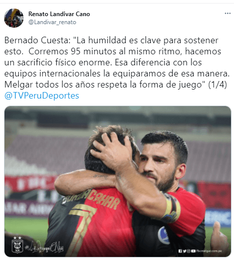 Bernardo Cuesta habló con TV Perú Deportes (Renato Landívar) y comentó el gran momento que están viviendo todos los ‘arequipeños’ en Copa Sudamericana: “La humildad es clave para sostener esto. Corremos 95 minutos al mismo ritmo, hacemos un sacrificio físico enorme. Esa diferencia con los equipos internacionales la equiparamos de esa manera. Melgar todos los años respeta la forma de juego”.