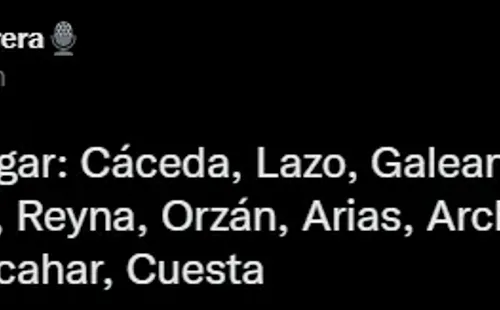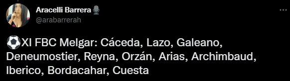 La periodista deportiva de ‘Radio Ovación’, Aracelli Barrera, adelantó cómo formará el equipo titular de Pablo Lavallen en su cuenta de Twitter, con algunos cambios para tomar en cuenta, a comparación del que jugó en Arequipa: “XI FBC Melgar: Cáceda, Lazo, Galeano, Deneumostier, Reyna, Orzán, Arias, Archimbaud, Ibérico, Bordacahar, Cuesta”.