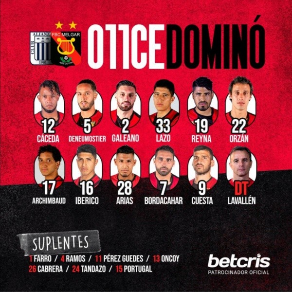 Minutos después de esto, como era de esperarse, con la información filtrada, la cuenta oficial de FBC Melgar se animó a mandar lo que es su equipo titular. Con la gráfica conocida, donde predominan sus colores: rojo y negro. Alertando a sus seguidores por los nombres nuevos según la decisión del comando técnico.