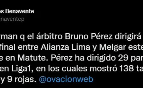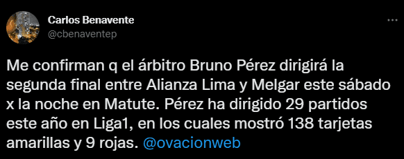 Lo que cuenta el director del portal web de dicho medio de comunicación es lo siguiente. Ojo a los hinchas de ambas instituciones: “Me confirman que el árbitro Bruno Pérez dirigirá la segunda final entre Alianza Lima y Melgar este sábado por la noche en Matute. Pérez ha dirigido 29 partidos este año en Liga 1, en los cuales mostró 138 tarjetas amarillas y 9 rojas”.