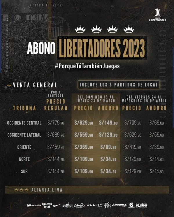 Los precios de Alianza Lima para los abonos de Copa Libertadores, preventa del 19 al 23 de marzo: Occidente central: S/ 629.90. Occidente lateral: S/ 559.90. Oriente: S/ 369.90. Norte: S/ 109.90. Sur: S/ 109.90. Mientras que, a partir del 24 de marzo al 5 de abril, los precios van de esta forma, la oferta que está vigente ahora mismo.