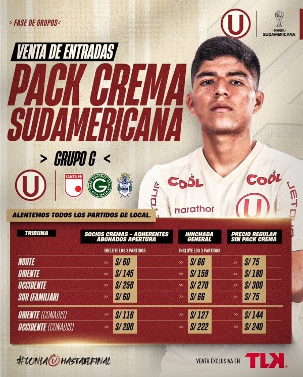 Por su lado, aparece Universitario de Deportes contesta en el mercado con su PACK CREMA SUDAMERICANA, con unos precios colocados después del estudio de su área de marketing. Los cuales vienen algo atrás, en comparación del clásico rival, cabe señalar que estos van dirigidos para Socios cremas, socios adherentes y abonados Apertura: