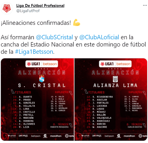 Las oncenas inicialistas para el duelo de hoy entre Alianza Lima y Sporting Cristal ya están confirmadas. Así lo hizo saber la red social principal de la ‘Liga de Fútbol Profesional’. Donde rimenses e íntimos lanzan a sus jugadores más importantes, según Roberto Mosquera y Carlos Bustos respectivamente.