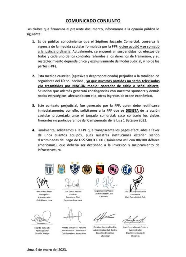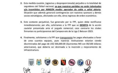 3. Este contexto perjudicial, fue generado por la FPF, quien debe rectificarse inmediatamente; por ello, solicitamos a la FPF que se DESISTA de la acción cautelar presentada ante el juzgado comercial; caso contrario los clubes firmantes no participaremos del Campeonato de la Liga 1 Betsson 2023.