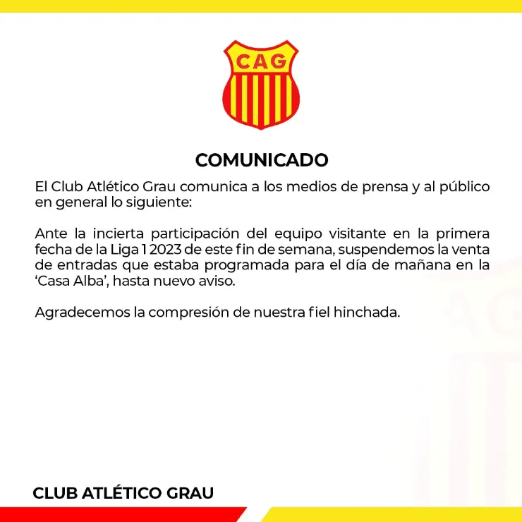 Ante las problemáticas que vienen sucediendo entre la FPF y algunos clubes, Atlético Grau suspendió la venta de sus entradas.Recordemos que iban a jugar contra Alianza Lima por la primera fecha de la Liga 1.
