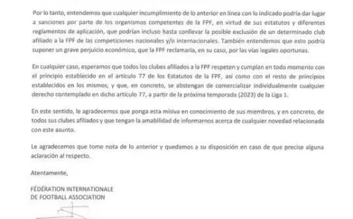“El comunicado de la FIFA es absolutamente contradictorio porque, por un lado, reconoce las relaciones de los derechos privados, y por otro, indican que la FPF te podría prohibir esa misma contratación. Es una cláusula de preferencia. Entonces, si yo reconozco tu contrato y la vigencia del mismo, también tengo que reconocer esa cláusula de preferencia, y no la puedo dejar de lado, porque estaría incumpliendo mi contrato y, por lo tanto, a mí me van a penalizar”, aseguró en una nota con Radio Ovación.