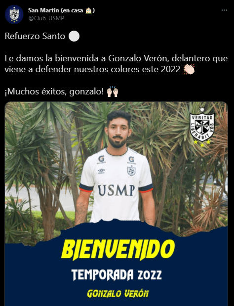 Si se trata de refuerzos interesantes por el nombre y pasado, este seguramente es de los más llamativos del 2022. Gonzalo Verón llega desde el fútbol ecuatoriano para vestir la camiseta de la Universidad San Martín. Su apellido llama mucho la atención y tiene un sentido por su apelativo.