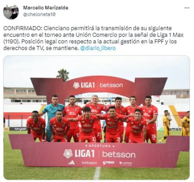 “Confirmado: Cienciano permitirá la transmisión de su siguiente encuentro en el torneo ante Unión Comercio por la señal de Liga 1 Max (1190). Posición legal con respecto a la actual gestión en la FPF y los derechos de TV, se mantiene”, publicó Marcello Merizalde.