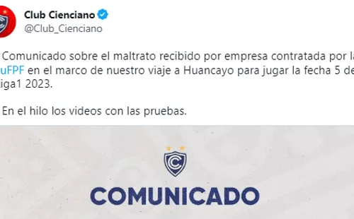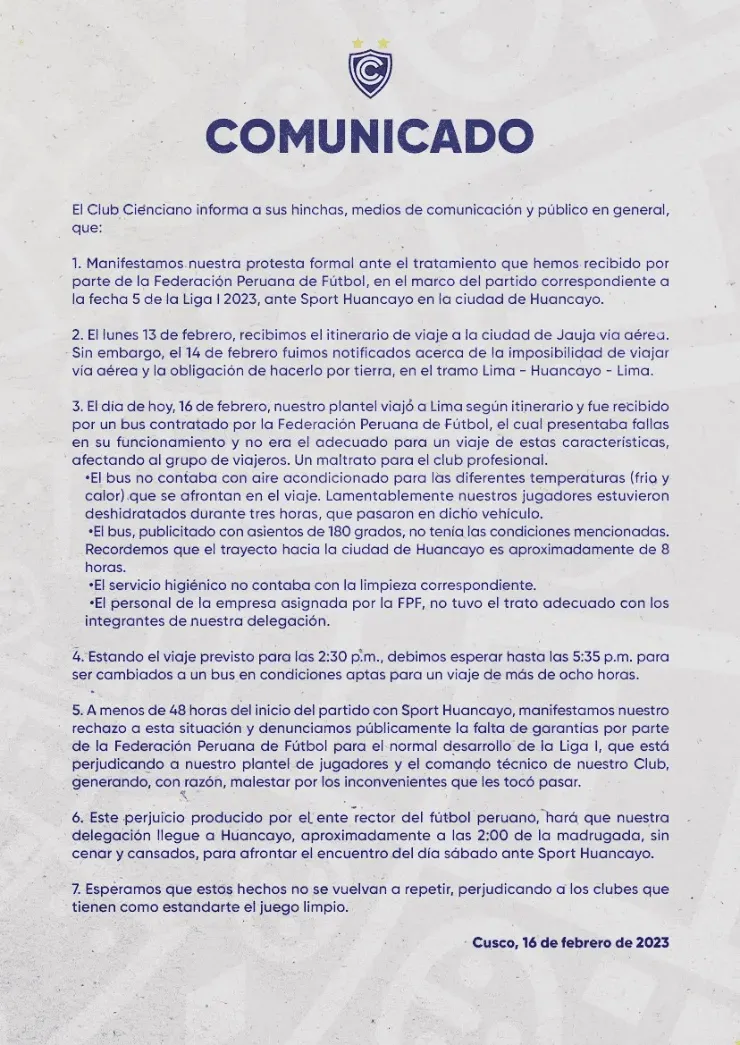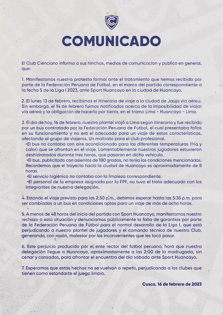 Se trata del Ciencianoque lanzó un fuerte comunicado, asegurando que recibieron un maltrato por la empresa de transporte contratada por la FPF, en la cual iban a ser trasladados a Huancayo para disputar la fecha 5 ante el Rojo Matador.