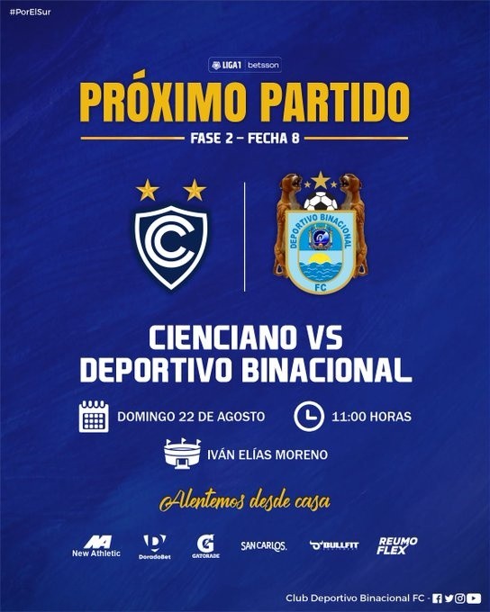 Por una nueva jornada de la Liga 1 de Perú, Ciencianorecibe en su territorio al conjunto de Binacionalen un cotejo que se realizará HOY, domingo22de agosto. Las emociones serán transmitidas EN VIVO Y EN DIRECTO a través de la pantalla de GOL PERÚ.