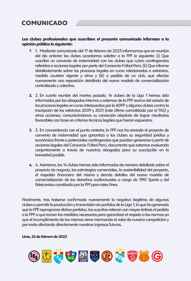 1. Mediante comunicado del 17 de febrero de 2023 informamos que en reunión del día anterior los clubes acordamos solicitar a la FPF lo siguiente: (i) Que suscriba un convenio de indemnidad con los clubes que cubra contingencias referidas a acciones legales por parte del Consorcio Fútbol Perú, (ii) Que informe detalladamente sobre los procesos legales en curso relacionados a estatutos, medida cautelar vigente y otros y (iii) a pedido de un club, que efectúe nuevamente una exposición detallada del nuevo modelo de comercialización centralizado y colectivo.