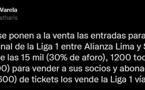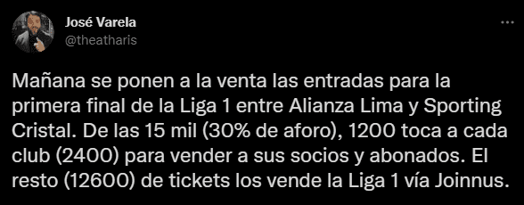 José Varela explica cómo será, cuándo será, y por dónde se venderán las entradas correspondientes: “Mañana se ponen a la venta las entradas para la primera final de la Liga 1 entre Alianza Lima y Sporting Cristal. De las 15 mil (30% de aforo), 1200 toca a cada club (2400) para vender a sus socios y abonados. El resto (12600) de tickets los vende la Liga 1 vía Joinnus”.