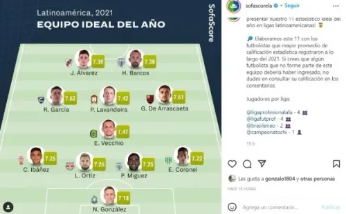 “¡Llegó el momento de presentar nuestro 11 estadístico ideal del año en ligas latinoamericanas!”, con esa publicación, la cuenta en Instagram de SofaScoreLa compartió la imagen con el equipo de ensueño. Basándose en un sitema 4-1-3-2, son 4 jugadores del fútbol argentino, 4 del fútbol peruano, 2 del fútbol brasileño y 1 del fútbol chileno.