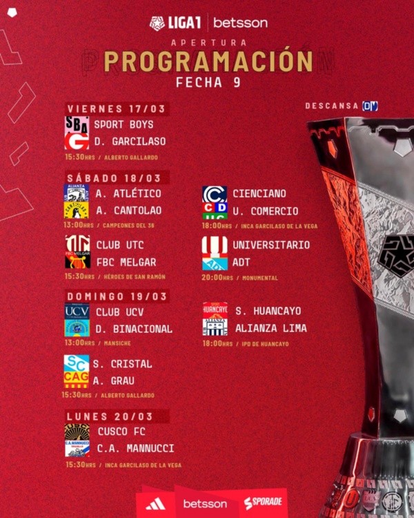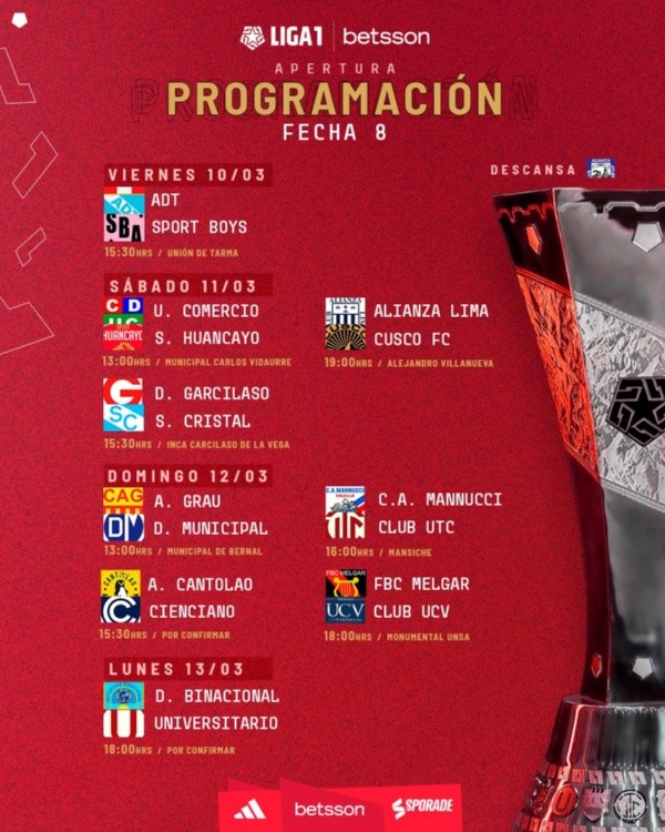 Mientras que la fecha 9 empezará el viernes 17 de marzo con el duelo entre Sport Boys y Deportivo Garcilaso. Descansando Deportivo Municipal, Universitario de Deportes jugará ante ADT el sábado, Sporting Cristal recibirá a Atlético Grau y Alianza Lima visitará a Sport Huancayo el domingo.