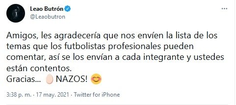 “Amigos, les agradecería que nos envíen la lista de los temas que los futbolistas profesionales pueden comentar, así se los envían a cada integrante y ustedes están contentos. Gracias…”, señaló en twitter el exportero de Alianza Lima.
