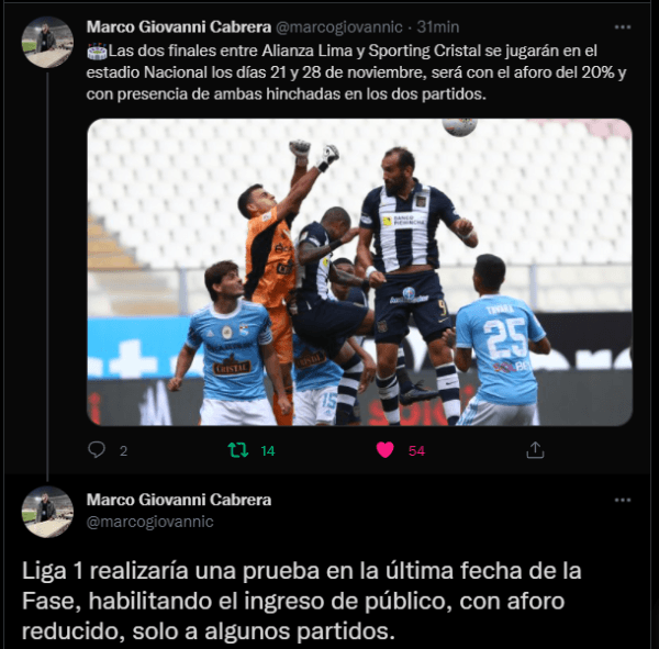 “Las dos finales entre Alianza Lima y Sporting Cristal se jugarán en el estadio Nacional los días 21 y 28 de noviembre, será con el aforo del 20% y con presencia de ambas hinchadas en los dos partidos. Liga 1 realizaría una prueba en la última fecha de la Fase, habilitando el ingreso de público, con aforo reducido, solo a algunos partidos”. Una gran noticia para los fanáticos del deporte rey.
