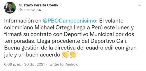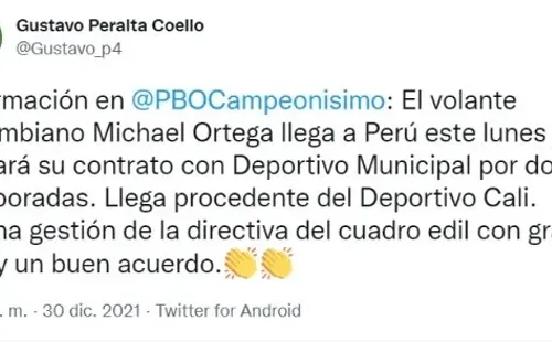 “El volante colombiano Michael Ortega llega a Perú este lunes y firmará su contrato con Deportivo Municipal por dos temporadas. Llega procedente del Deportivo Cali. Buena gestión de la directiva del cuadro edil con gran jale y un buen acuerdo”, así lo confirmó el periodista Gustavo Peralta de ESPNen su cuenta de Twitter.