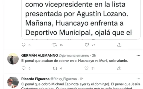Ahora, el partido fue el de Deportivo Municipal contra Sport Huancayo. Tras un polémico pena, Horacio Zimmermann, también opositor a Lozano, saćo un dato no menor: “Raúl Rojas, presidente de Sport Huancayo, era primer vicepresidente en la lista de Agustín Lozano. Buenas tardes”.