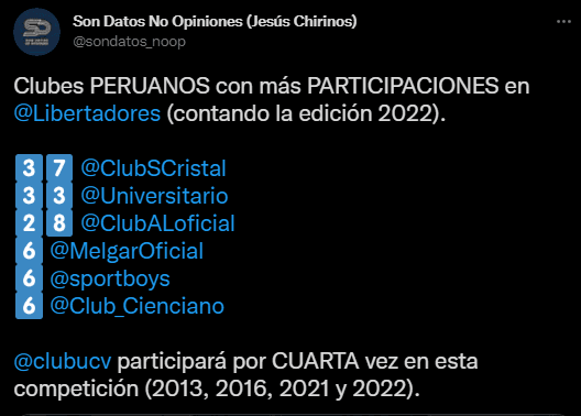 “Clubes PERUANOS con más PARTICIPACIONES en Copa Libertadores (contando la edición 2022): 37 SPORTING CRISTAL, 33 Universitario de Deportes, 28 Alianza Lima, 6 FBC Melgar, Sport Boys, 6 Cienciano del Cusco. César Vallejo participará por CUARTA vez en esta competición (2013, 2016, 2021 y 2022)”. Podrán estar conformes con ello, pero esta información está verificada al ciento por ciento. Pase y disfrute, esto es solo un deporte.
