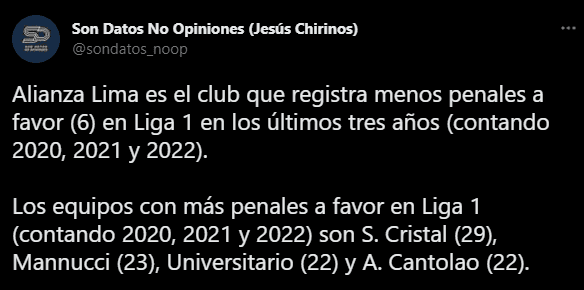 Para contrastar lo dicho por el director técnico campeón en la temporada pasada, podemos respaldarnos en la cuenta de Twitter especializada, Son Datos No Opiniones (Jesús Chirinos) “Alianza Lima es el club que registra menos penales a favor (6) en Liga 1 en los últimos tres años (contando 2020, 2021 y 2022)”.