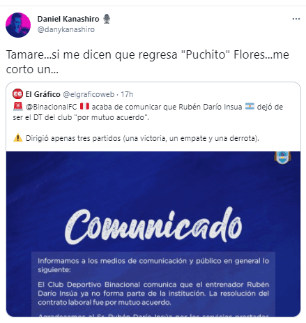 Conocido por su comentario frontal y ácido. El periodista deportivo y narrador; Daniel Kanashiro, emitió una opinión bastante cómica en su cuenta principal de Twitter, con respecto al despido o salida ‘por mutuo acuerdo’ de Rubén Darío Insúa y Deportivo Binacional.