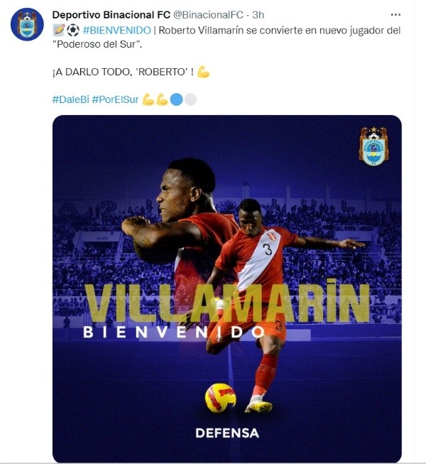 “Bienvenido. Roberto Villamarín se convierte en nuevo jugador del ‘Poderoso del Sur'”, anunciaron las redes de Deportivo Binacional. Entendiendo que el lateral derecho estará por toda la temporada 2023 de la Liga 1, el futbolista tendrá la gran responsabilidad de conseguir algún ticket internacional para la campaña 2024.