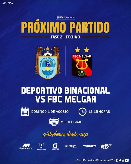 Por una nueva fecha de laLiga 1 de Perú,Deportivo Binacionalrecibe en su territorio al conjunto de Melgaren un encuentro que se disputará este domingo 1 de agosto. Las emociones de este partido se transmitiránEN VIVO Y EN DIRECTOa través de la pantalla deGOLPERÚ.