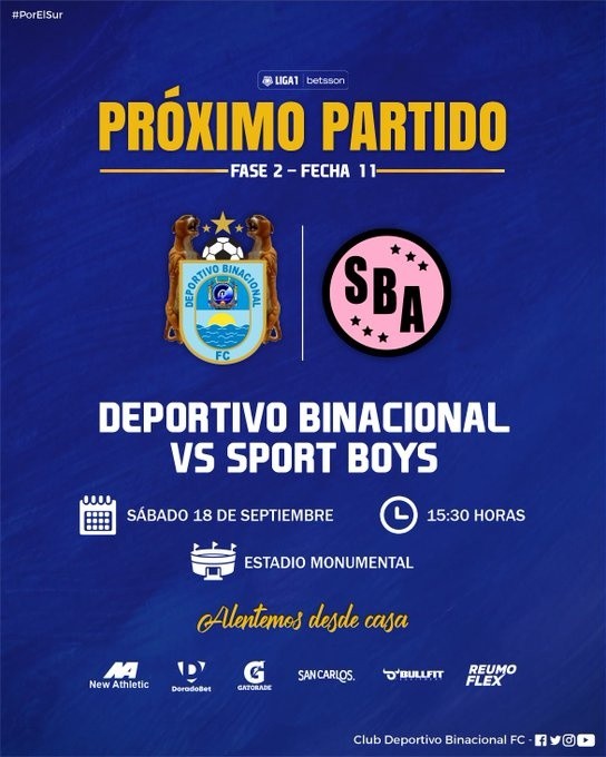 Por una nueva fecha de laLiga 1 de Perú,Deportivo Binacionalrecibe en su territorio al conjunto del Sport Boysen un juego que se desarrollará este sábado 18de septiembre. Las emociones de este emparejamiento serán transmitidas a través de la pantalla de GOL PERÚ.