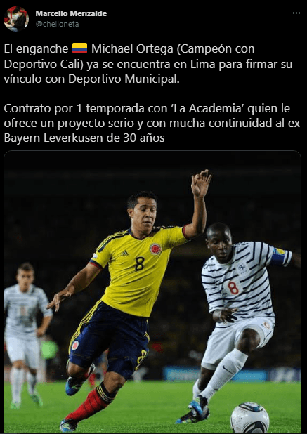 La información confirmada la brinda el periodista, Marcello Merizalde, quien confirma lo que adelantó anteriormente: “El enganche colombiano Michael Ortega (Campeón con Deportivo Cali) ya se encuentra en Lima para firmar su vínculo con Deportivo Municipal. Contrato por 1 temporada con ‘La Academia’ quien le ofrece un proyecto serio y con mucha continuidad al ex Bayern Leverkusen de 30 años”.