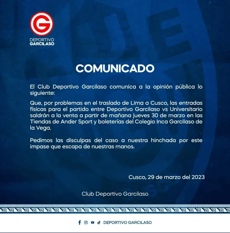 Sin embargo, en la previa de este cotejo, el equipo local sorprendió con un comunicado vía redes sociales. El equipo celeste informó que las entradas físicas recién las venderá a partir del día jueves 30 por problemas logísticos.