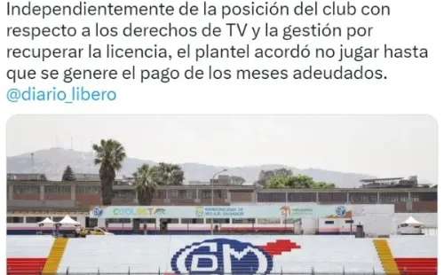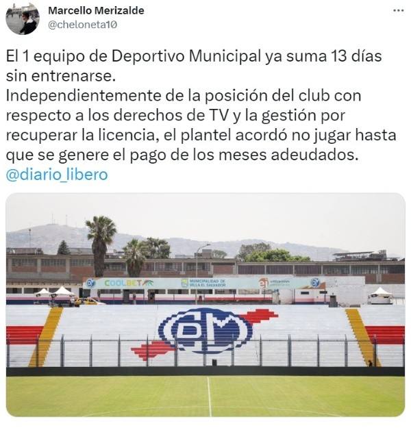 Así lo informó el periodista Marcello Merizalde a través de su cuenta de Twitter. El hombre de prensa colocó en conocimiento público el problema por el que atraviesa Deportivo Municipal en la temporada 2023 de la Liga 1.