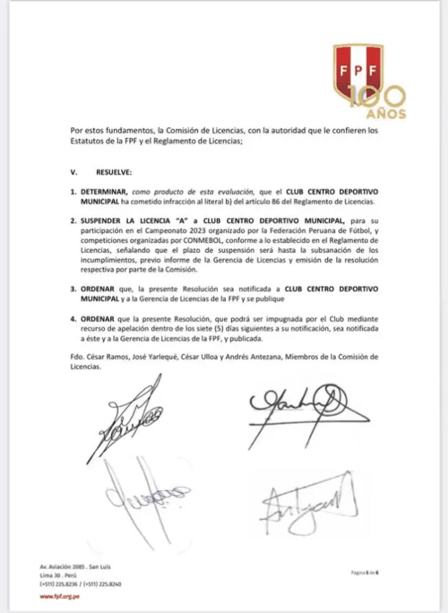 “Suspender la Licencia A al Club Centro Deportivo Municipal para su participación en el Campeonato 2023 organizado por la Federación Peruana de Fútbol, y competiciones organizadas por Conmebol”, es lo que se lee en el documento.