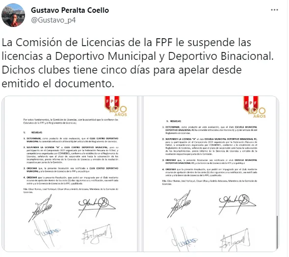“La Comisión de Licencias de la FPF le suspende las licencias a Deportivo Municipal y Deportivo Binacional. Dichos clubes tienen cinco días para apelar desde emitido el documento”, publicó.