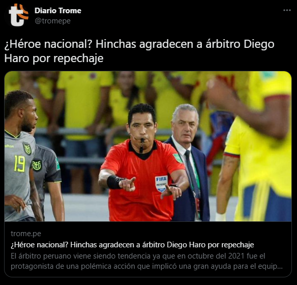 Ante toda esta marea de comentarios, se publicó un comunicado por parte de referí peruano FIFA, Diego Haro. Donde presenta lo siguiente, denunciando una suplantación de indentidad, comentarios, y hechos delictivos en su contra, los cuales buscan dañar su integridad. Rompiendo algunas reglas del arbitraje internacional, lo cual afectan su trabajo profesional.