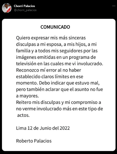 ‘El Chorri’ después del golpe mediático que lanzó ‘Magaly TV’ tuvo que aceptar sus culpas, y bajar la cabeza para asumir sus responsabilidades. Por eso, mediante una emotiva carta, publicada en sus redes sociales, se refirió a su entorno más cercano, con unas palabras de arrepentimiento.