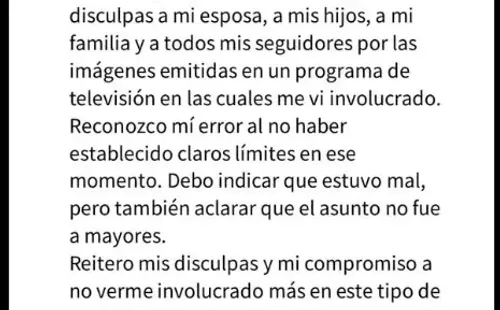 Empezó demostrando su más profundo sentimiento de culpa: “Quiero expresar mis más sinceras disculpas a mi esposa, a mis hijos, a mi familia y a todos mis seguidores por las imágenes emitidas en un programa de televisión en las cuales me vi involucrado”.