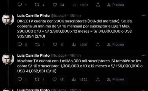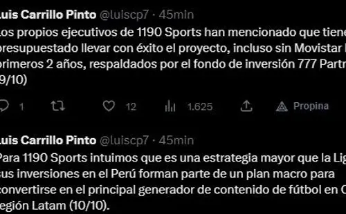 “¿Por qué para 1190 Sports le resulta decisivo cerrar con Movistar Liga 1 Max en su grilla para hacer su proyecto de modelo asociativo viable y llegar a los 60 millones de dólares anuales requeridos?. Abro hilo con números claves para sustentar esta teoría”. Es la apertura en la red social del pajarito, para después soltar todo lo que sabe.