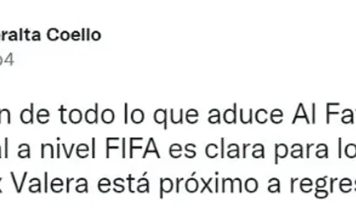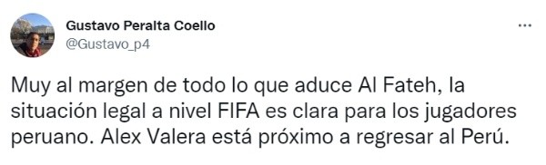 “Muy al margen de todo lo que aduce Al Fateh, la situación legal a nivel FIFA es clara para los jugadores peruanos. Alex Valera está próximo a regresar a Perú”, comentó el periodista Gustavo Peralta en su cuenta de Twitter.