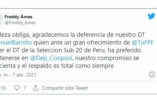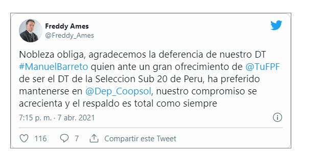 La información la dio a conocer Freddy Ames, presidente de Coopsol: “Nobleza obliga, agradecemos la deferencia de nuestro DT Manuel Barreto quien ante un gran ofrecimiento de la FPF de ser el DT de la Seleccion Sub 20 de Perú, ha preferido mantenerse en Deportivo Coopsol, nuestro compromiso se acrecienta y el respaldo es total como siempre”.